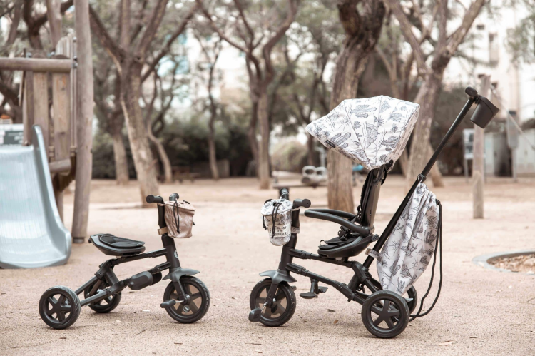 תלת אופן מיננה 2023 בשיתוף Q play. מתקפל. דו כיווני. עם תיקי אחסון. מקום לבקוק/כוס.