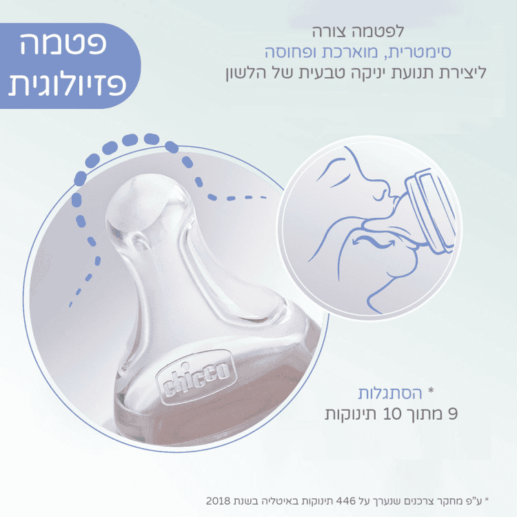 • בסיס הפטמה רחב ומעוגל כדי ליצור התאמה מושלמת לשפתי התינוק, ולהקל על תנועת היניקה.