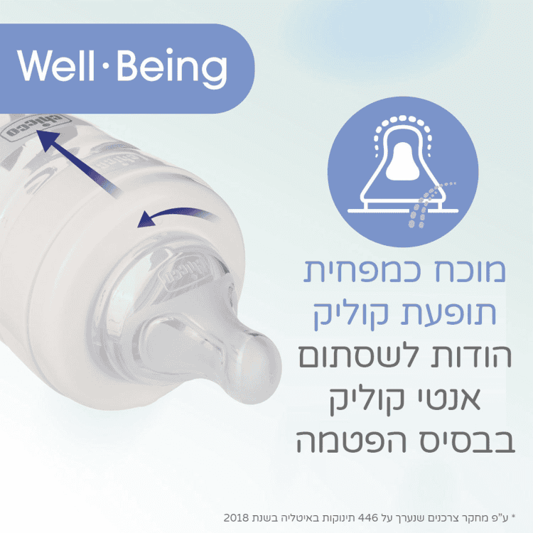 • בקבוק וולביאינג של צ’יקו אידיאלי להאכלה יומיומית, עוזר להפחית את תופעת הקוליק, רגורגיטציה (מעבר של מיצי קיבה או של מזון לא מעוכל אל הגרון ואל חלל הפה) ומרגיע את התינוק.